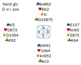 Det er nesten utenkeleg at øst har passa med Dxxx i spar. Etter dei første stikka er kløveren markert som 4-4. Han ville difor hatt eit enkelt uttakt i 3kl framfor ein svært spekulativ pass (han har nok relativt lite poeng sidan vest dobla på direkten når makker kan vere blank). Difor spelte eg spar 8 (spar til 9en hadde fungert like godt) som fekk behalde stikket, deretter spar konge og spar til knekten og spar ess. Vest saka først ruter og så to rundar hjarter. På den siste sparen må han legge ein kløver eventuelt ein høg hj. Aktuelt la han ein kløver som er best. No kunne eg spele hjarter dame som vest vann. Han sette meg no prøve med ein liten ruter, men eg gjekk opp med 10en, ruter til esset og hjarter som vest vinn, men han må gi bordet det siste stikket for ruter konge. Poeng for å klare ruterbehandlinga, er både direkte dobling av 2nt og at han let meg vinne for hjarter 10 (trur han har kontroll).