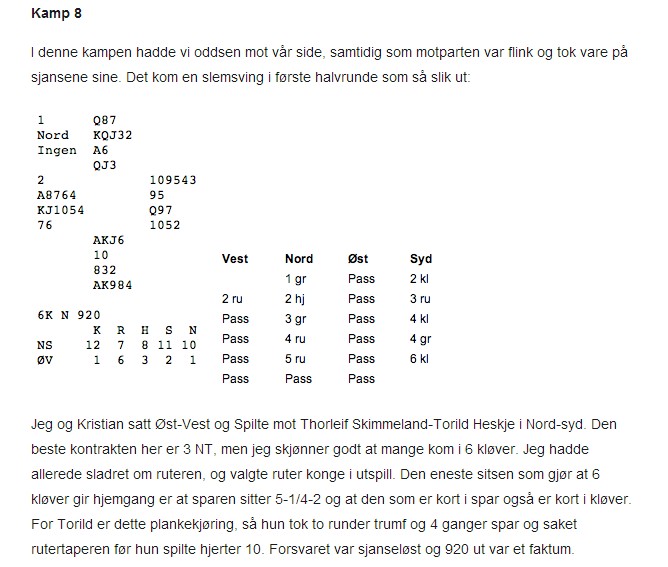 Denne gangen vil jeg starte med å takke de som bruker tid og krefter for at vi andre skal få spille kort. Ronny Korsmo gjør et arbeid han fortjener stor heder og ære for. Per Nordland, Svein Jarle Ludvigsen og de andre TL'ene holder en stø hånd over alt det som har med lover, regler og teknikk å gjøre. Hotellet hadde lagt lista litt høyere denne gangen, men det er ikke mer enn det må være.