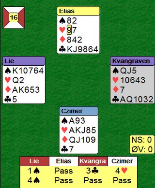Kløver stakk Nils helt korrekt med esset og kongen kom deisende på. Så kløver ti til stjeling, ruter konge og ruter til esset. Kløver dame, bort med en spar i bordet. Spar ess og spar til stjeling, ruter til hånda og siste spar til stjeling.