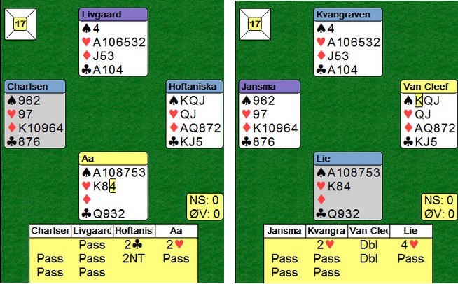 Jeg vet ikke hvorfor Allan ikke åpnet med 2hj, men det mulig de ikke kan ha to esser. I 4hj satt det greit og +590 til Norge. Fire beiter i 2NT ga en nier inn til Norge.