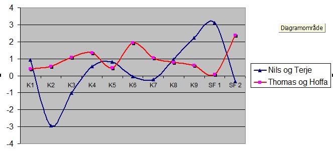 Det er rett og slett imponerende av Thomas og Thor Erik å score pluss i alle rundene, sammenlignet med snittet i salen. Det vitner om solid spilling. Nils og Terje hadde en marerittrunde (Kamp 2), men etter det har det vært tett og fint derfra også. Nils og Terje hadde nesten 0,4 i snitt totalt, mens Thomas og Hoffa scoret litt under 1 IMP i snitt. Sterkt.