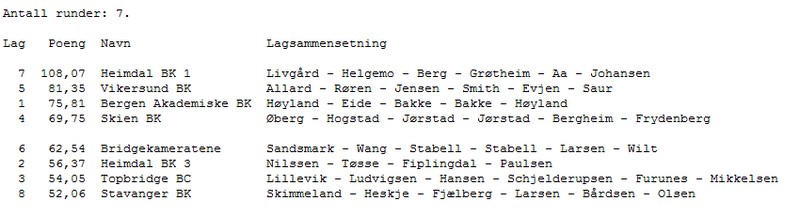 Det har vært klart lenge at seieren ville gå til Heimdal. De gikk ubeseiret gjennom mesterskapet, noe som sikkert har skjedd før, men er langt fra vanlig. Rett og slett verdige mestre. På andreplass kom Vikersund. Gledelig! En gjeng med joviale og muntre gutter som spiller god bridge. De bruker kanskje ikke 4kl og 4sp som Blackwood, men det viser seg gang på gang at det holder meg sunn fornuft og godt gammeldags bondevett. Bronse til Høyland fra Bergen, heller ingen bombe.