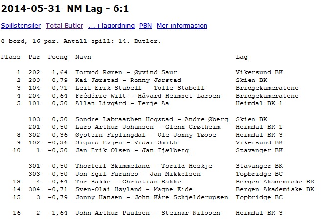 Veteranlaget støttes av NBF med startkontingent og landslagsskjorter, men dekker alle andre kostnader selv. Parene er Helge og Roald Mæsel, Arve Farstad - Tor Bakke og Peter Marstrander - Rune Anderssen. Alle seks er velkjente spillere som har vunnet et utall av norske mesterskap, så rutinen skal det ikke stå på. (Men rutine er vel vanlig i et mesterskap for seniorer?!?) De har ikke med seg noe offisielt støtteapparat, men undertegnede vil hjelpe de litt med det praktiske.