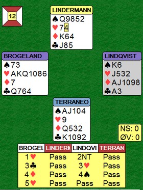 I spill 12 melde østerrikerne altfor hardt og havnet i en steindød 6 hjerter. Boye og Espen tok det litt mer med ro, men klarte ikke å stoppe før i 5 hjerter. Men selv der var det problemer. Med spar ut ville kontrakten vært sjanseløs, men med trumf ut fikk Boye sjansen:
