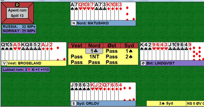 Russeren var heldigvis dårligere (?) enn Terje Lie, så Orlov gikk inn på sparesset og spilte på hjerteren (!) i 3NT. Der er en avhengig av kappen pluss 3-3 sits. I ruter mangler det bare at tieren ikke gir stikk. En heldig utgangssving til Norge siden Boye og Espen fikk tre i kløver, hjerter 9 og ruteresset