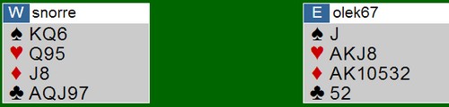 Det er slike spill som det under som avgjør lagkamper. I vest åpnet jeg med 1NT og ble etter noen melderunder plassert i 6ru som spillefører. Et poeng er at øst spurte i Blackwood og da viste jeg mitt ene ess. Da meldte øst 6ru uten å invitere til storeslem, så det er mye som tyder på at det er et ess vekk.