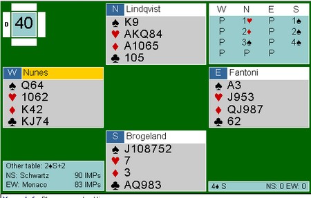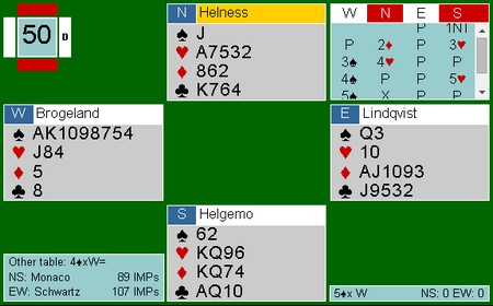 GEO må våge å ta tak i slemstatistikken til det norske parene, Kvangraven - Lie noe, men spesielt Hoftaniska - Charlsen. De siste hadde misforståelser over en lav sko og selv om de gjetta rett enkelte ganger, var det i mine øyne mer bingo enn bridge til tider. Gambling og gjetting med dårlige odds er noe som hører hjemme i Casino, ikke ved bridgebordet. Hoffa og Thomas har meldt i BIN de siste månedene, og selv om paret sier at de ikke var maks forberedt og heller ikke uthvilte da de meldte, viser det seg gang på gang at det hjemmesnekra systemet deres har store huller. Det er ikke bare å tro at en kan finne på nye konvensjoner som skal slå etablerte "sannheter" når det gjelder meldesystemer. Det er fint å vite om kortfarger, men paret brenner seg flere ganger på at de vet ikke nok om verken honnørstyrke eller antall trumf de har tilsammen. Her har du etter min mening en jobb å gjøre, GEO!