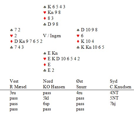 Bare to par stoppet før utgang, 6 par var i 3 NT av S med 11 stikk og 6 par i 5 kløver av S med 12 stikk, ett par fikk 13. Bare Anders Fugleneb (N)- Olav Erik Didriksen (S) fant fram til den flotte lilleslemmen 6 kløver. De meldte slik:
