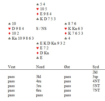 Han fikk det normale utspillet med kløverknekten. Du ser sikkert at ruter ut vil ødelegge alle forbindelser og gir beit, men det forringer ikke en flott prestasjon.