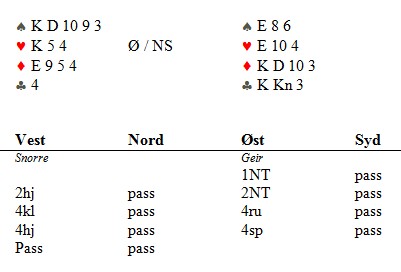 ED satt bak i kløver så vi måtte være i 6ru. Dit kommer vi bare hvis jeg melder 3ru over 2NT. (og at Geir støtter til 4ru). Når jeg meldte 4kl var vi sjanseløse. Geir nedvurderte KKn i kløver og jeg hadde meldt hånda mi ferdig.