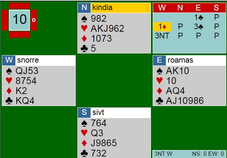Jeg meldte 3NT i full fart uten å ta meg de nødvendige sekundene. Dette gjør vi alle og som regel blir vi ikke straffet. I slike spill skal vi oftest stoppe i 3NT, men det haster ikke å undersøke. 1ru benekter femkort major (Hauge-systemet). Jeg burde startet med 3ru for å vise hold der, så fortsetter makker med 3sp (hold i spar, men ikke i hjerter). Da kommer vi alle fall i 5kl, kanskje vi finner slemmen også. Det er for dumt å gå to sonebeiter i 3NT når det er 12 toppstikk i kløver.
