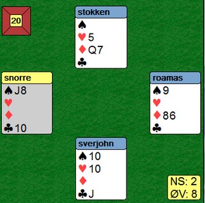 Jeg spiller sparen min, men vest har ikke mer. Øst har altså falsecardet fra E10 igjen, men det er ikke så farlig. Jeg stjeler med hjerter knekt, tar for hjerter ess og stjeler meg hjem med kløver til hjerter åtte. Vest kaster en ruter. Nå er stillingen: