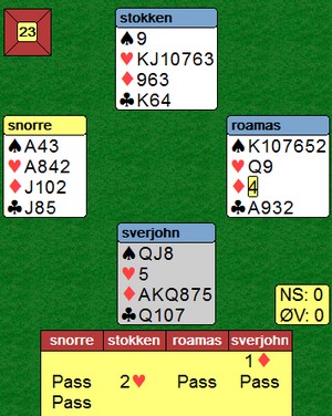 Tidlig i spillet hadde jeg plassert sparlengden og ruterlengden i vest. Derfor hadde øst hjerterlengden. Det var den tanken som aldri slapp. :-)