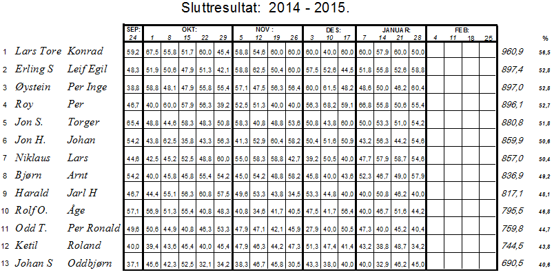 Trine og Hilda gikk ut i kjempetempo fra start og hadde vel opp i imponerende 90% til pause nå på tirsdag. Det buklandet nok noe, og tilslutt var det igjen Geir og Odd Harald som grep de siste poengene for en førsteplass. Det betyr at Odd Harald og Geir leder etter to kvelder, Jo-Gaute og Frank på andre, og Hilda og Trine på tredjeplass.