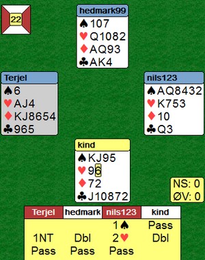 Jeg tror de aller fleste av oss hadde passet med syd sine kort, men Sunndalsøras store sønn så potensialet i sine kort når makker hadde vist en god åpning, sannynligvis med firekort hjerter. Trumf ut og Nils klarte bare fem stikk for -800. Tøft!!