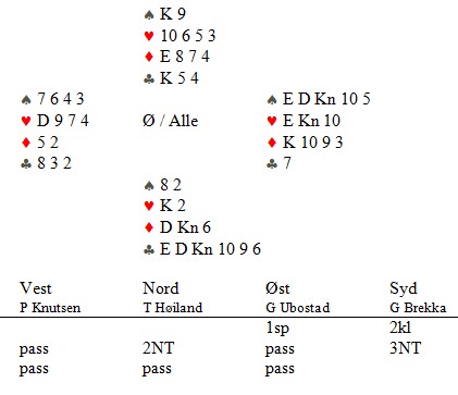 Calle Knutsen åpna ikke unaturlig i Multi (Svake 2hj) og da var det ikke mulig å finne rutertilpassen. Utenfor sonen er vel vest sin hånd nesten verdt 1hj? Spillet er ikke spilt på det andre bordet enda, men oppdatering kommer så snart det er gjort.