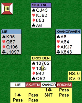 Jeg er aldri noen tilhenger av å melde NT uten hold i motpartens farge, men alternativene var verre for Sverre Johnsen. Spar ut til damen, hjerter til knekten og mer spar til esset. Nå bomma øst ruter med en liten til damen og en ny til nieren. Fire spar stikk, fire hjerterstikk og EKn i ruter ga fire sonebeiter. På den andre hånda kommer sparkongen ut og da er en MYE lengre. Treffer en minorfargene, kan det vinnes åtte stikk.