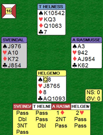 Tor og Geir kommer i en steinhard 3NT, men hadde vest hatt hjerteresset måtte Noralia klart å cashe fire ruterstikk. Nå ble det fire sonebeiter til tross for at EKD i ruter felte knekten. Jon Sveindal fant hjerterskiftet i stikk fire!!