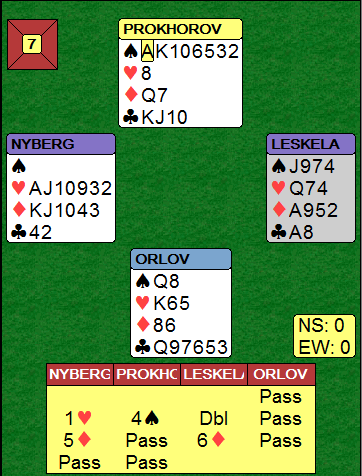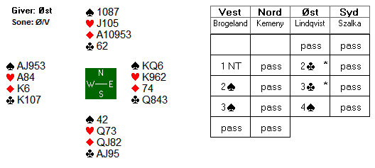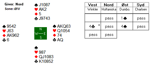 6 par vant 4 hjerter, tre av dem var doblet, ingen klarte å bete utgangen.