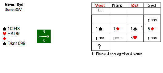 Oppgave 3: Hva tror du makker må ha for å melde 5 hjerter? Ville du som vest høynet til 6 hjerter?