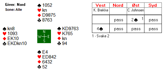 Det hele endte med to beit og 300 til Christian og Sofie. Denne scoren ga ikke mange poeng da en stor andel av parene hadde fått spille majorkontrakt i sonen øst-vest.