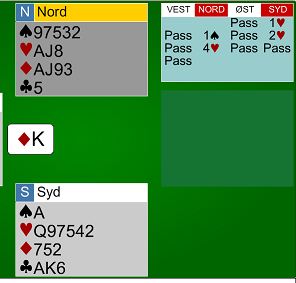 Du har 14 HP, klar styrke for åpning, og laveste farge av flere 4- korts er vanlig start. Nord sin innmelding forstyrrer, hvis dere bruker negative doblinger vil dobling fra makker i Øst normalt love 4+ i både hjerter og spar eller en major pluss 4+ ruter tilpasning. Men makker krever med 2 hjerter og lover ca 11+ hp og 5+ hjerter. Dere er nær utgang, men du kan ikke melde 2 spar! Dette vil være et revers- bud og love 15+ HP samt 4 spar+ 5. ruter. 2 NT viser rett styrke, men du har jo ikke hold i kløver! Hva da?