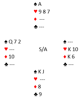 Syd var inne og han hadde avgitt kun ett stikk. Han spilte ruter 8 og trumfet med spar ess, så en ikke stående hjerter som han kastet en godspilt kløver på! I det stikket måtte vest trumfe bare for å være nødt til å avslutte fra Q-7 i trumf rett inn i syds K-J. Elleve stikk, ett redoblet overstikk, og det gir den uvanlige scoren +1480.