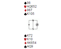 At Øst hadde 9 hp var mer enn forventet, Syd hadde jo resten og trumfen 3-2 imot ga få vansker. Selv om Nord uten poeng hadde steng i kløver var det ikke mulig for motparten å få mer enn 2 stikk, Det ga +910, men delkontrakt i ruter med 11 stikk ville likevel gitt topp! 4 kløver gir bare 10 stikk.