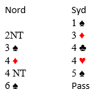 Liv Marit forteller: “Spilleføringen gikk fort, Markus tok sparfinessen og noterte tretten stikk for ren kasse. Det som imponerte meg mest etterpå var tankegangen i meldingene. Han var mest opptatt av hvordan vi skulle melde etter Blackwood hvis vi hadde alle nøkkelkortene og trumf dame for å kunne komme oss i storeslem. Jeg gleder meg til fortsettelsen med Markus».