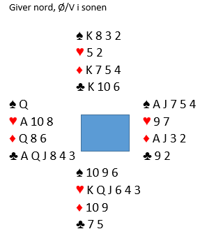 Du er altså i 3 grand som vest og får hjerter 5 ut fra nord. Det virker naturlig å lasjere hjerteren, og kanskje ligge unna de to første i tilfelle hjerteren sitter 5-3 som langt i fra er umulig etter åpning 2 hjerter i disse soneforholdene. Hvis du gjør det vinner syd de to første hjerterstikkene og spiller (aktuelt) kløver, selv om kanskje spar 10 i skift ville vært bedre motspill. Vest legger kløver knekt og nord følger med liten, godt motspill da det gjør det problematisk med overgang til hånden (vest). Da spillet forekom fulgte ruter til knekten og kløver til damen og kongen. Dette var igjen: