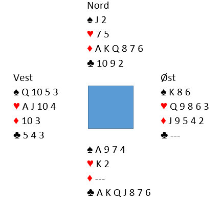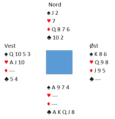 Så for at forsvaret skal ha en sjanse etter denne starten må vest stikke med spar dame og spille mer trumf. Den vinnes med tieren, og da ser det slik ut: