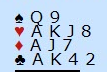 Etter å ha valgt riktig i et par spill hadde vi en misforståelse i ett spill og meldte en latterlig storeslem som nesten ikke hadde noen sjanse – en bet og tapt spill. I spillet etter satt jeg nord med disse kortene med syd som giver og ingen i sonen: