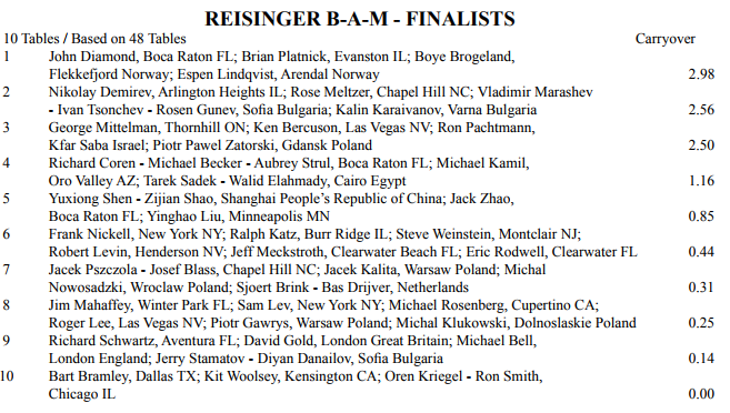 Feltet i REISINGER er slanket til ti lag som skal spille finalerunder søndag (amerikansk tid). Brogeland og Lindqvist på lag med John Diamond og Brian Platnick leder.