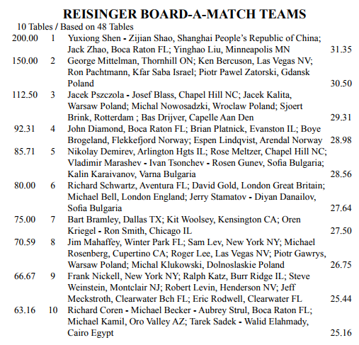 US FALL NATIONALS ble avsluttet i San Diego søndag med hovedturneringen Reisinger. Boye Brogeland og Espen Lindqvists lag DIAMOND (firemannslag med John Diamond og Brian Platnick) var i tetbildet gjennom hele turneringen. Men til slutt endte de på fjerdeplass, en sterk prestasjon selv om de lenge så ut til å kunne kjempe om seieren.