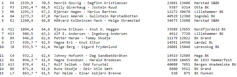 Årets mestertreff spilles denne uken med samme spill for alle som spiller på samme dag i klubber over hele landet. Mandagens mestertreff hadde 264 deltakende par (noen få puljer mangler visstnok fortsatt i resultatene). På topp finner vi Henrik Gosvig-Dagfinn Kristiansen fra Harstad S&BK med 70,5 prosent.