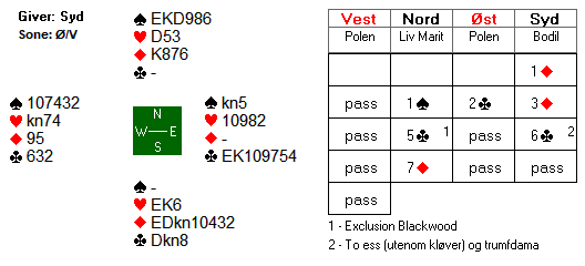 Jeg tror ikke svenskene hadde helt kontroll på meldingsforløpet, men etter at øst valgte å reversere på sine 14 gode poeng, stod vest på til 6 ruter.