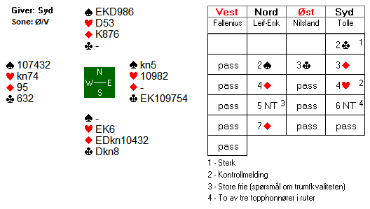 Tolle spilte ut ruter 10, og det kunne se ut som et lovende utspill når bordet kom ned, men spillefører hadde ruter dame og ikke noe annet alternativ enn å la ruteren gå til damen. Nilsland tok to runder trumf og spilte spar, og da fikk syd for esset og øst claimet resten.