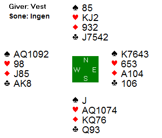 Som vi ser er 6 kløver spilt av øst så godt som ubetelig uansett sits hos motparten (6NT hadde vært det aller tryggeste). Hjerteren er beskyttet, og man kan godspille et sparstikk for avkast av hjerteren.