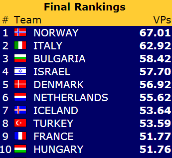 Ved det andre bordet hadde grekeren åpnet med 1kl på Espen sine kort, og da kom de bare i 3NT og dermed 12 IMP til Norge.