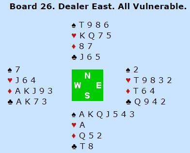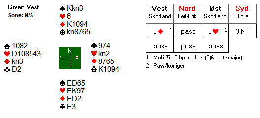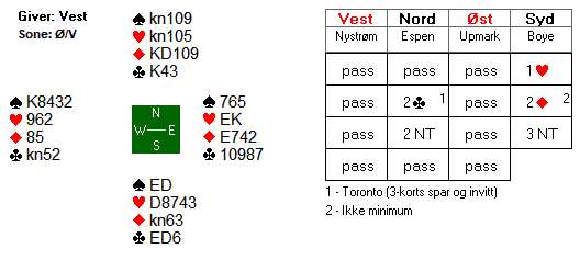 1 grand viste 14-16 hp. Nord satt bak med ei opplagt straffedobling, og han satt klar til å doble det meste. Ulfs redobling viser etter systemet begge minor. Nils var imidlertid ikke helt sikker på betydninga, og prøvde seg med 2 hjerter. Etter at nord doblet nok en gang, flyktet Ulf i 3 kløver. Etter å ha tenkt seg litt om, doblet Ola Rimstedt for tredje gang.