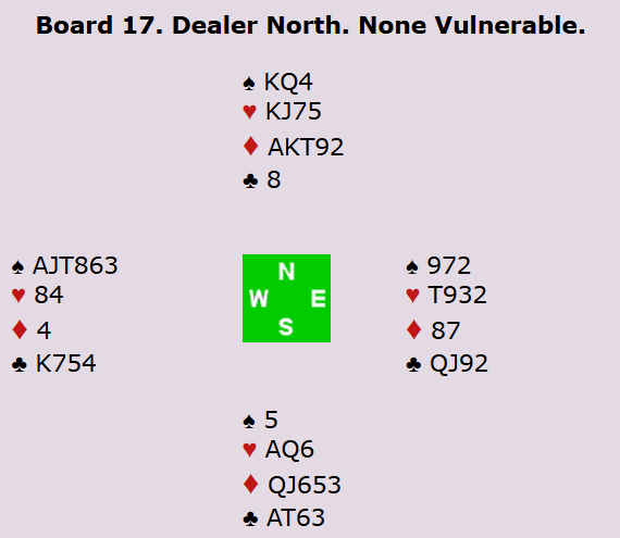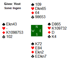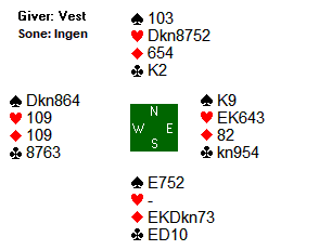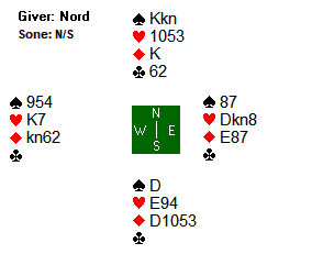 Ulf spilte ut spar 2 (norsk fordeling). Nils fulgte med femmeren, før spillefører vant med dama. I stikk to spilte Mikael en ruter til kongen. Nils stakk med esset, og returnerte spar 7 (lavinthal til hjerter). Spillefører innkasserte så tre stikk i hver av minorfargene, men mer var det ikke å hente. Dermed ei beit.