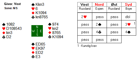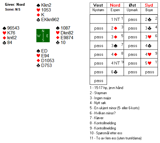 Da har Boye en overgang for lite på hånda til å stjele godt ruterstikk nummer to. Aktuelt stakk øst, og fortsatte med en hjerter. Boye vant med esset, og innkasserte ruter dame, før en ny ruter til stjeling fulgte. Da knekten kom på fra vest, var det tolvte stikket i havn.