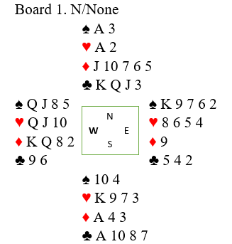 Jeg sa nesten, for du ser vel den ene feilen i dette diagrammet? Vest har igjen ett kort mer en de andre, og det er fordi han ennå ikke har kastet på den femte sparen. Hvis han kaster en hjerter vinner spillefører tre hjerterstikk til slutt, og hvis vest kaster en ruter kan spillefører tar for ruter ess og felle den siste ruteren og bruke hjerter konge som inntak til å hente godspilt ruterstikk. Men det satt ikke helt sånn, og kontrakten gikk bet etter at vest var flink og unngikk ruterutspill som ville forært spillefører kontrakten.