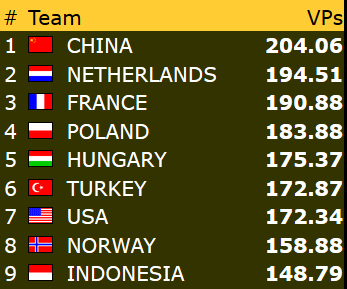Norge er dermed utslått etter å ha tapt 63 - 141 mot Kina 3.