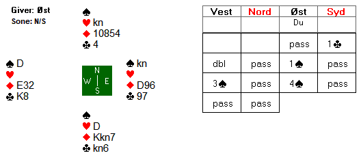 Hanne Rostad (S) åpnet med 1 ruter og Lise Klev (N) svarte 1 hjerter. Arne Marthinussen (Ø) gikk så innpå med 1 spar og Hanne hoppet til 4 ruter (lagfarge men begrenset styrke). Jeg (V) hadde god fordeling, derfor valgte jeg å kjempe med 4 spar. Lise hadde mer å by på, meldte derfor 5 ruter men Arne lot seg ikke slå ut og gjenmelde fargen sin. 5 spar ble dermed sluttbud, og Rostad spilte ut ru A til røff i bordet. Arne fortsatte med trumf til esset og stjal sin siste ruter. Damen kom da på fra Nord. Ny trumf til kongen, både N og S fulgte. Så kom kl 8 til knekt fra Syd og den fikk beholde stikket. Er køver fargen 3-2 imot er jo alt vel og bra. Syd fortsatte med ruter som Arne stjal og registrerte at kongen kom på fra Lise. Da kl K så ble tatt var syd renons, det var illevarslende, for Nord hadde dermed hold i fargen. Men kan kontrakten likevel stå? Arne forsøkte ved å spille liten hjerter mot bordet og Lise vant med knekten. Ny hjerter til esset og kongen fra Hanne. Tegningen var klar. Lise var merkert med 2-4-3-4 i fordeling og hadde igjen kl Dx og hj D. Arne hadde sp D, hj 9 og kl 8. På sp 3 var Klev skvist, sakte hj D men da vant Arne stikk for hj 9 og kunne avslutte spillet med kløver til esset. +650 var ren topp, to andre par hadde fått 10 stikk men det var i 4 spar. Ruter av Syd med 9-10 stikk var også spilt.