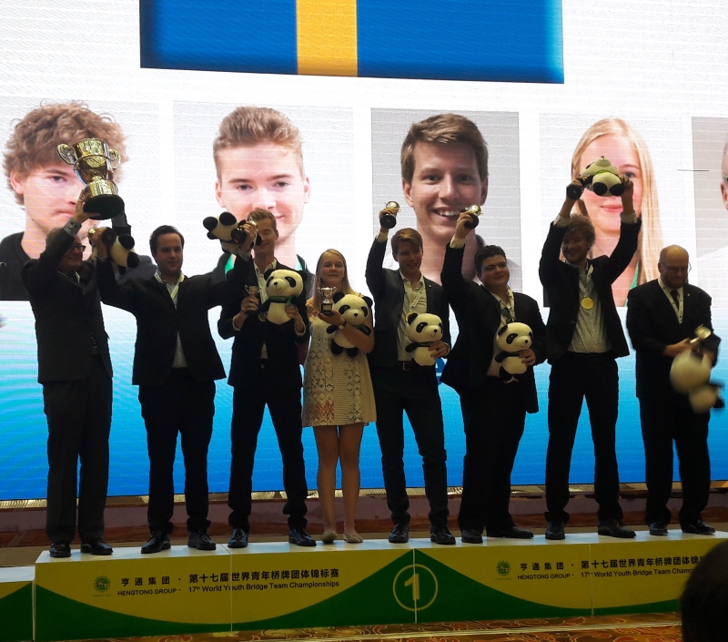 Sveriges U21-lag hadde en ledelse på 25 IMP etter gårdagens fire sett i sin finale mot Israel. Israelerne hadde et solid førstesett i dag og var i ledelsen med åtte IMPs margin idet spillerne gikk til lunsj i dag. Det var lite IMP i sving i siste sett, men Sanna Clementsson bidro sterkt til å sikre seieren for svenskene da hun åpnet med en ellevepoenger og 4-4 i major. Da kom hun og makker Alexander Sandin i utgang, mens israelerne stoppet i delkontrakt. Da alle spillene var sammenlignet viste resultattavla at svenskene hadde slått Israel 118-112, og dermed sikret VM-gull nummer to for Sverige. Rett og slett imponerende av vårt broderfolk!