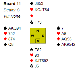 Jeg var selv i 6 kløver og låste meg kanskje litt på analysen av denne ruterkombinasjonen. Det er teknisk sett to muligheter, enten kongen i saks, eller J-10 (--) foran. For å få prøvd begge deler må det spilles to ganger ruter mot øst, den første med liten til nieren som en annen dag kunne ha dratt kongen fra syd, og om ikke det fungerer er det en sjanse til, en ruter til fra vest og finesse med damen. Så vest må ha to inntak til å spille ruter for å få prøvde begge sjansene, og det finnes, kløver dame og spar gir overganger til vest.