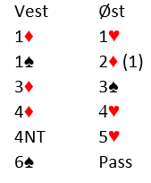 (1) 2 ruter var utgangskrav (XYZ). Da vest viste ekstra lengde i ruter avga øst en sleminvitt (minst mild sleminvitt), og vest kontrollmeldte ruter. Det var forsåvidt gunstig for øst som hadde singelton kløver (åpneren har ikke så mye bortkastet i kløver), men øst syntes han allerede hadde gjort nok og sa 4 hjerter. Men vest hadde en god del ekstra og gikk på en gang til.