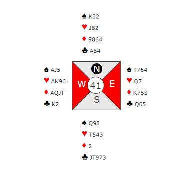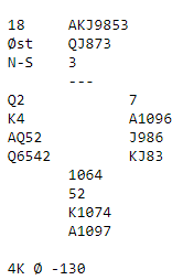 Ved begge bordene ble kontrakten 4 spar etter at Ø/V hadde vært med i meldingene. Derfor ble kontrakten 4 spar doblet ved det ene bordet. Om Ø/V har vært med og meldt og støttet kløver er det naturlig med kløver ut. Da forsvinner en ruter fra nord med det samme på kløver ess, og det spilles for overstikk.
