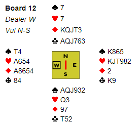Ved det andre bordet meldte N/S 5 kløver og mine lagkamerater stampet i 5 hjerter som ble doblet, 300 i bet etter klølverutspill og det fine motspillet som forfremmer syds trumf dame. Det ga et 12 IMP bidrag til vinnerlaget på sin vei mot en overbevisende triumf.